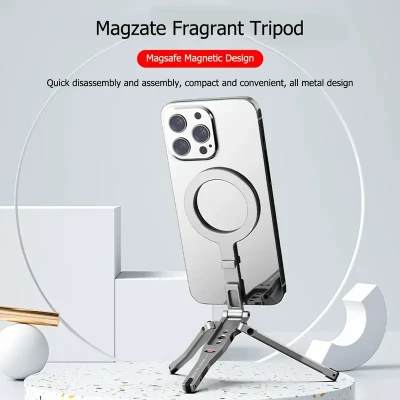 Adjustable Aluminum Magnetic Tripod Stand for Smartphones - Compact desktop lazy stand with foldable design, 360° rotation, no batteries required
